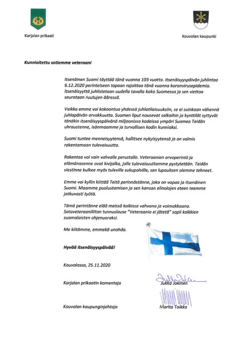 Kouvolan kaupungille ja Karjalan prikaatille on tärkeää muistaa veteraaneja ja vaalia heidän perintöään. Vallitsevassa poikkeuksellisessa tilanteessa emme voi järjestää koottuja juhlallisuuksia. Sen sijaan muistamme heitä kirjeellä, jonka allekirjoittivat Karjalan prikaatin komentaja ja Kouvolan kaupunginjohtaja.