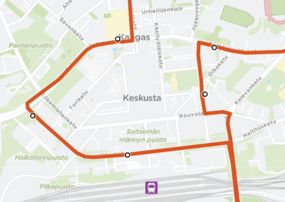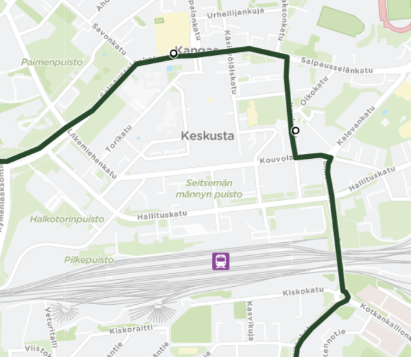 - Käännytään Kouvolankadulta Koulukadulle ja siitä Salpausselänkadulle. Ajantasaus Pääkirjaston pysäkillä.