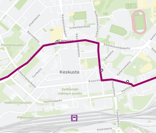 - Käännytään Kouvolankadulta Koulukadulle ja siitä Salpausselänkadulle. Tasaus Kankaan Koulun pysäkillä.