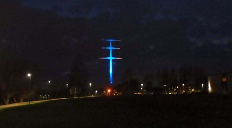 KSS Rakennus toteutti pylvään valaistuksen marraskuun aikana ja nyt viimeiset säädötkin on saatu valmiiksi. Vakiona pylväs loistaa sinertävänä, mutta juhlapäivinä väri vaihtuu – itsenäisyyspäivänä siniseksi ja jouluna punaiseksi. Ohjauskeskuksesta voi valita tarvittaessa 10 muuta värivaihtoehtoa.
