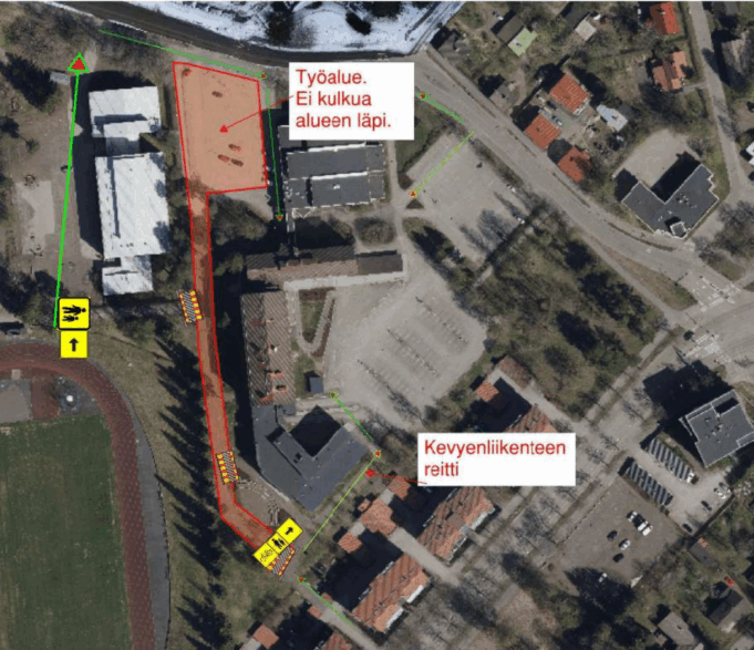 Alueella liikkuvia pyydetään noudattamaan erityistä varovaisuutta ja seuraamaan työmaa-alueen opasteita. Pahoittelemme työstä aiheutuvaa haittaa.