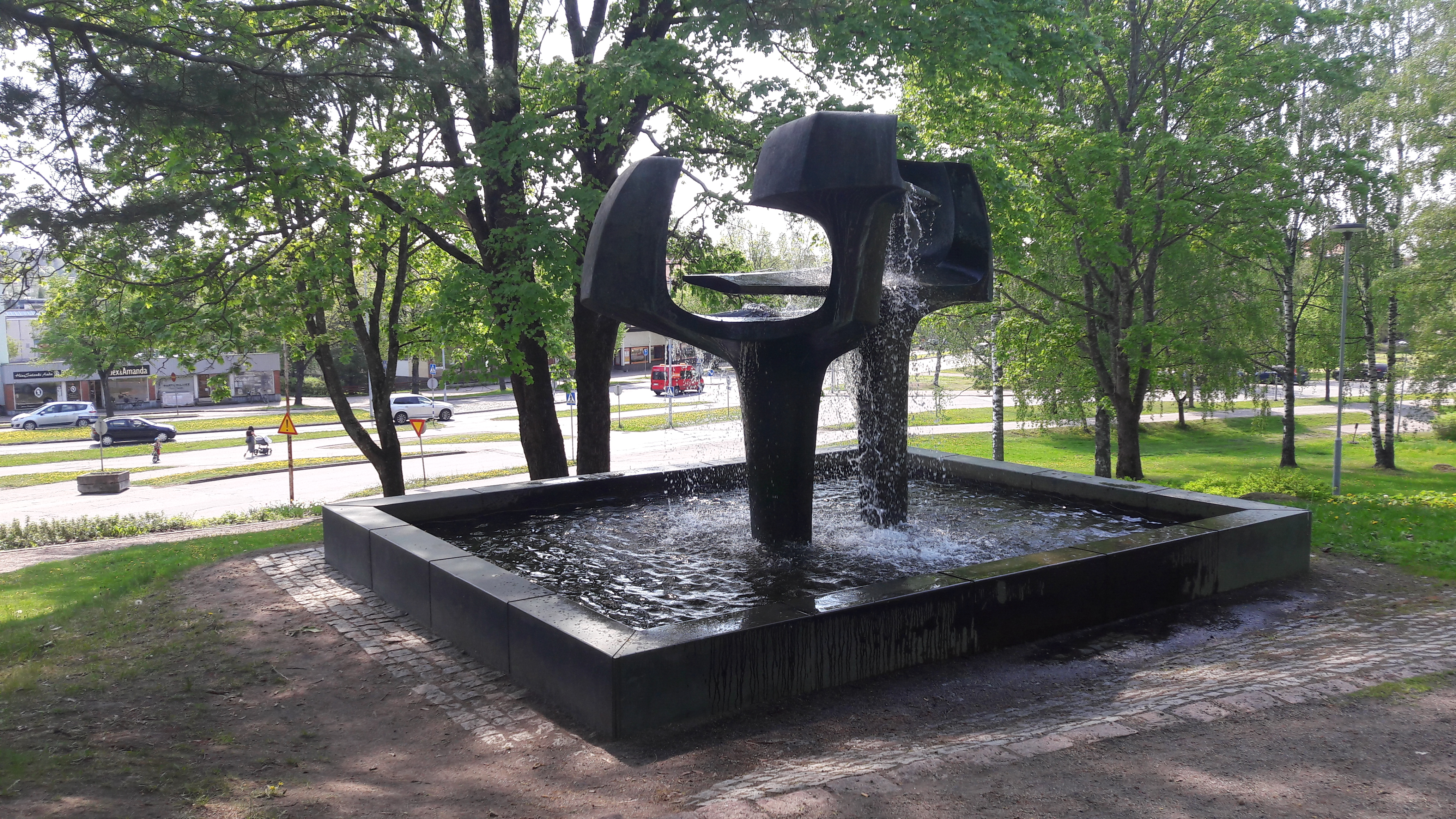 Kimmo Pyykön pronssiveistos ”Kolmoiskosket” on solissut puiston rinteessä vuodesta 1971.