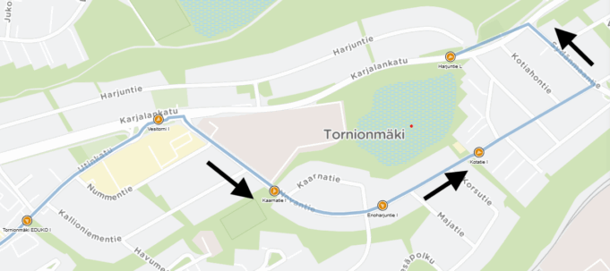 Reitti 9: Jaalan koulu I, Jaalantie, Heinolantie, Nuujanmäentie, Kuusaantie, Kyminkatu, Suoratie, Mäyräkorventie, Kuusaantie, Kauppamiehenkatu, Hallituskatu, Utinkatu, Tornionmäki Eduko I