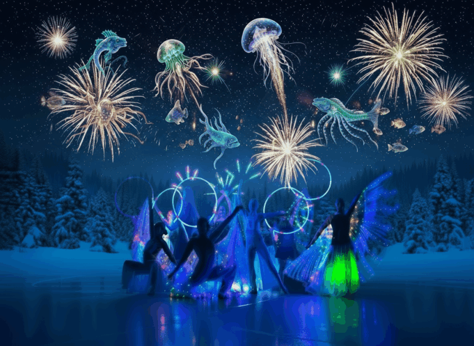 Jaalan kunnan entisen vaakunan kultatynnyristä pilkottavat kolme hopeista kalanpyrstöä kertovat lohenkalastuksen, käsityötaitojen ja vesistöjen merkityksestä alueen historiassa. Uudenvuoden aattona esitettävä valoteos saa innoituksensa tästä perinteestä. Teos esittelee erilaisia mielikuvituksellisia kalaolentoja, joita Jaalan vesissä voisi eri aikakausina uiskennella. Syksyn aikana Jaalan alakoulun oppilaat ovat suunnitelleet ja maalanneet omia kuvitteellisia kalojaan. Näistä teoksista on koottu yhteinen teos, joka heijastetaan kolmiulotteisena Jaala-areenalle. Teos nähdään ensimmäistä kertaa uudenvuodenaattona 2025 ja se juhlistaa Jaalan yhteisöllisyyttä ja paikallisidentiteettiä valoteoksen kautta. Valoteoksen työpajat ja teoksen editoinnin toteutti valotaiteilija Mia Erlin.